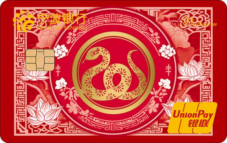 蛇年生肖白金卡是寧波銀行以“金蛇獻(xiàn)瑞,開卡有?!睘橹黝}在蛇年發(fā)行的白金借記卡,共推出“典雅版”和“萌趣版”兩款。“典雅版”設(shè)計運(yùn)用中國傳統(tǒng)剪紙手法設(shè)計,金色生肖蛇圖案盤繞在繁花似錦的蓮花中,透過花窗之美,盡顯活色生香的古色風(fēng)韻?!懊热ぐ妗币钥ㄍㄉ邽榛{(diào),三維立體的造型搭配春節(jié)喜慶色調(diào)以及元寶金幣的元素,象征著財富和收獲。卡片具有儲蓄、轉(zhuǎn)賬結(jié)算、購物消費、代收代付、個人理財、電話銀行等多種功能。