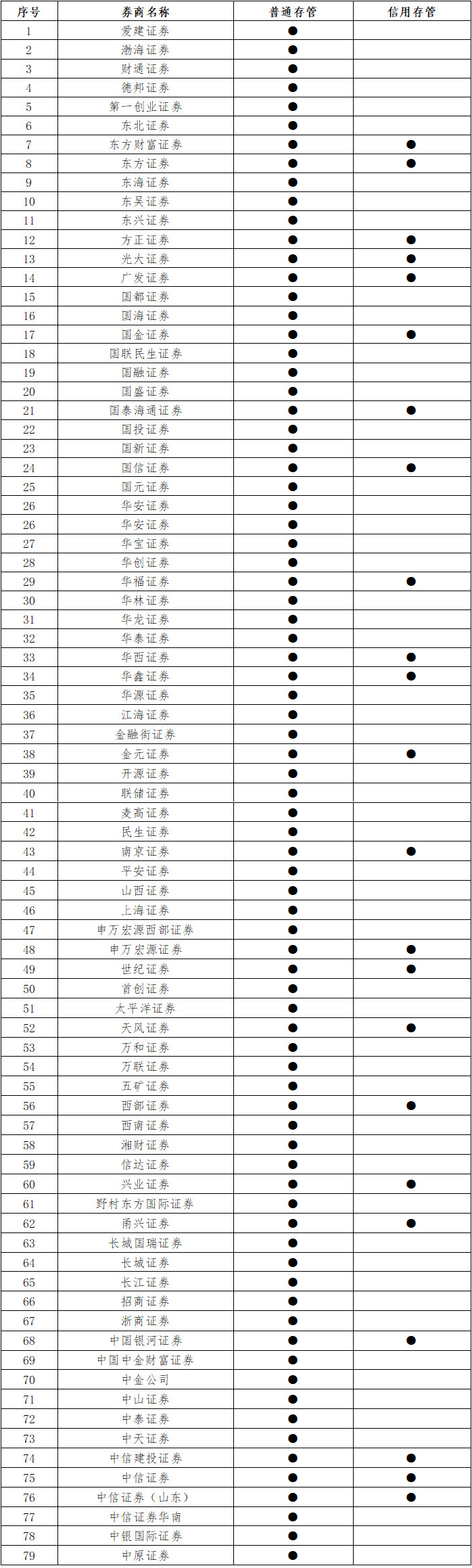 截至目前,我行三方存管業(yè)務(wù)的合作證券公司共79家,其中同時合作普通存管和信用存管的共23家。具體名單如下(按拼音排序,排名不分先后):